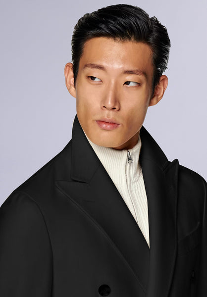 Product Features Double-breasted silhouette Delicate drape Peak lapels Soft and smooth Jet flap pockets Pliable